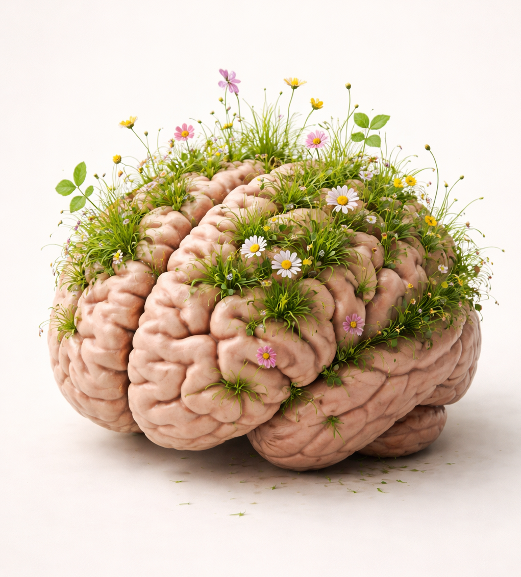 Ein menschliches Gehirn auf einem neutralen Hintergrund. Aus den Windungen des Gehirns wachsen Gras, kleine Blumen und Blätter.